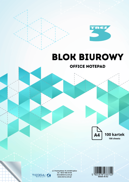 Praktyczny blok biurowy marki TRES w formacie A4 zawiera 100 kartek w kratkę, idealnych do codziennych notatek, szkiców i zapisków. Wysokiej jakości papier zapewnia komfort pisania długopisem, ołówkiem i piórem.