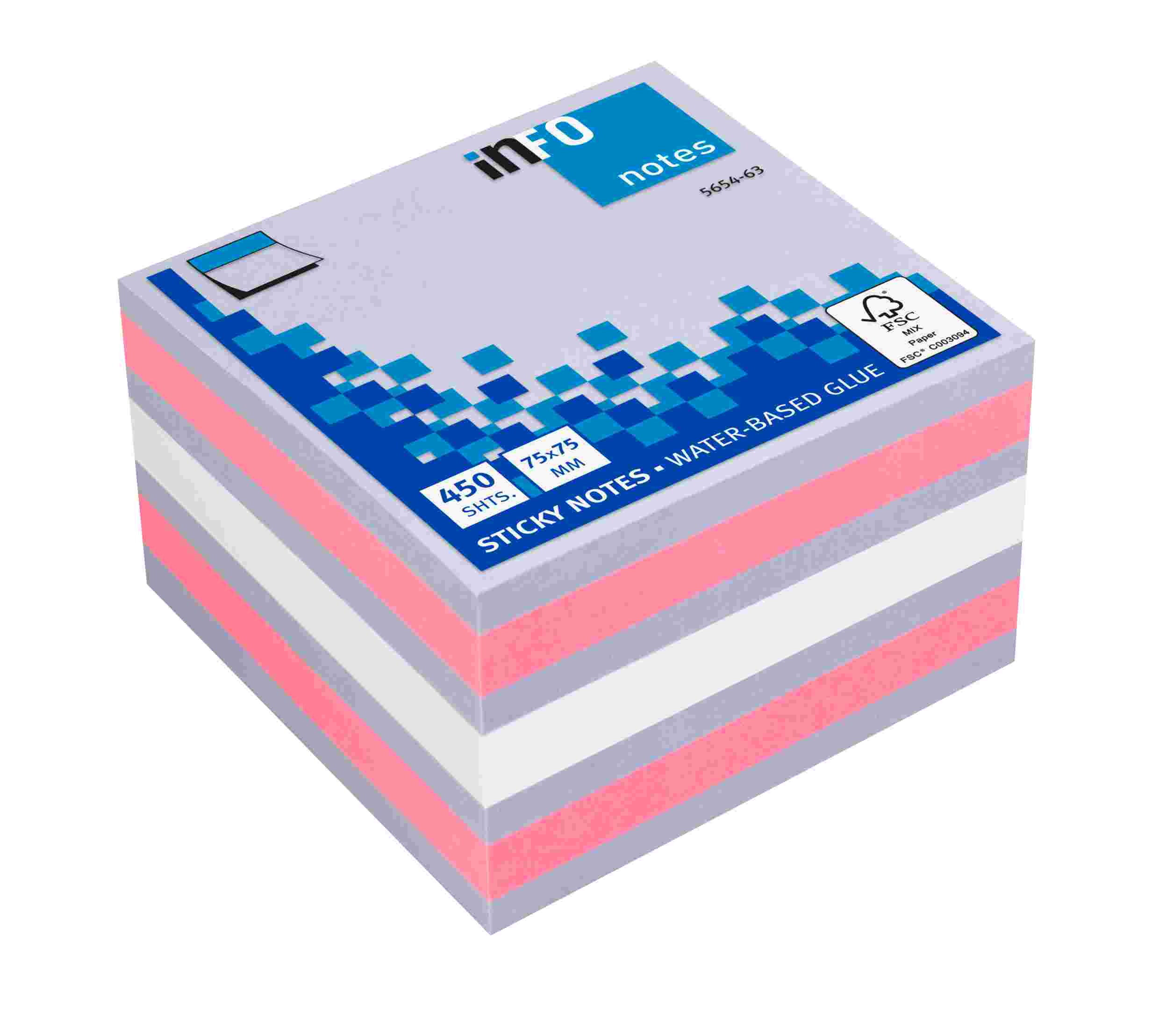 Kostki samoprzylepne wykonane z wysokiej jakości papieru z samoprzylepnym paskiem. Możliwość wielokrotnego przyklejania i odklejania pojedynczej karteczki. Klej na bazie wody. Kostki występują w 450 kartkowych bloczkach. Gramatura 85gsm