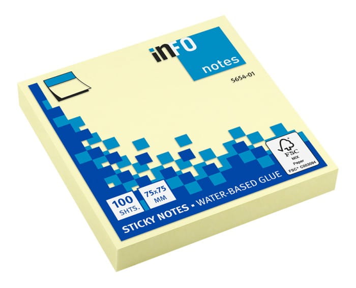 NFO to kompaktowy notes samoprzylepny w klasycznym żółtym kolorze, idealny do codziennych zapisków w biurze, domu lub szkole. Zawiera 100 karteczek o wymiarach 75x75 mm, które łatwo się odrywają i dobrze przylegają do różnych powierzchni.