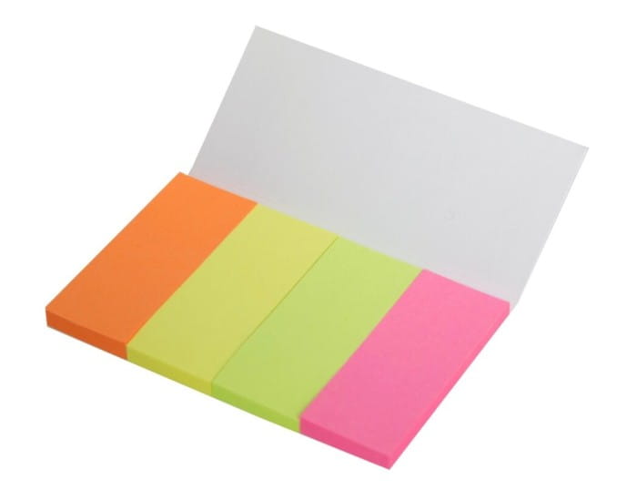 Zestaw papierowych zakładek indeksujących w 4 intensywnych kolorach: pomarańczowym, żółtym, zielonym i różowym. Idealne do zaznaczania stron, notatek i organizacji dokumentów. Wygodny format i kompaktowa okładka sprawiają, że łatwo je przechowywać i mieć zawsze pod ręką.